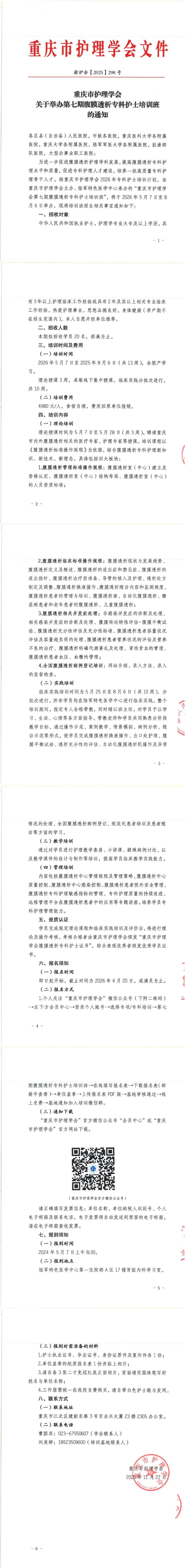 重庆市护理学会 关于举办第七期腹膜透析专科护士培训班的通知